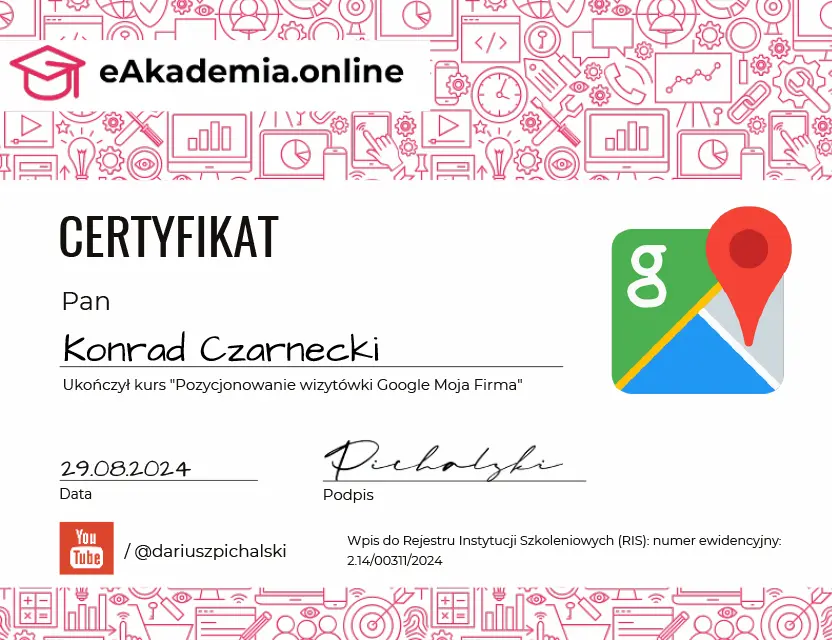 Posiadam certyfikat ukończenia specjalistycznego kursu z zakresu tworzenia i pozycjonowania wizytówek Google. Dzięki zdobytej wiedzy i umiejętnościom zapewniam profesjonalne i skuteczne usługi, które pomogą Twojej firmie wyróżnić się w sieci.